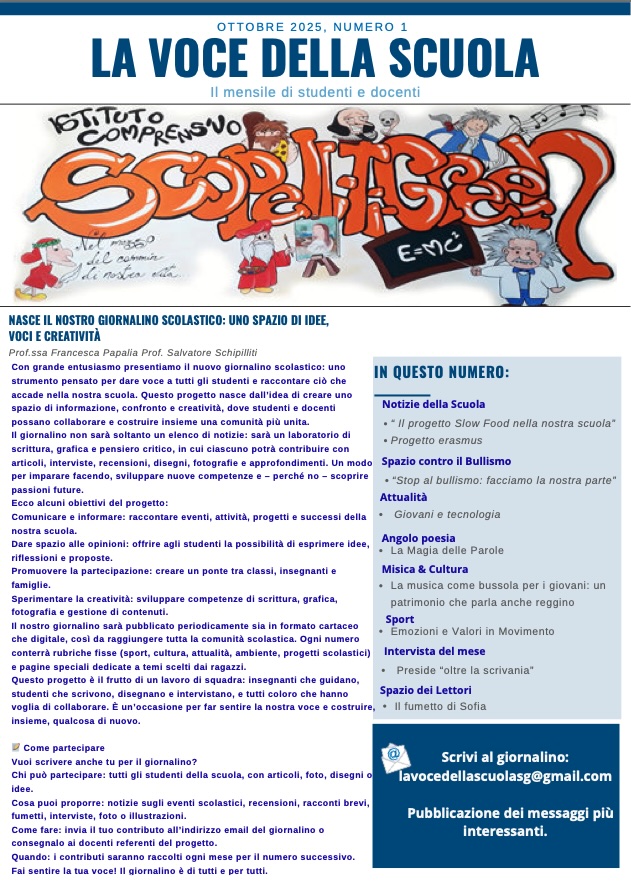 Dopo il grande entusiasmo che ha accompagnato la nascita del nostro giornalino scolastico, siamo felici di presentarvi il secondo numero! In poche settimane questo progetto ha iniziato a crescere, grazie all’impegno, alla curiosità e alla creatività di tanti studenti e insegnanti che hanno deciso di mettersi in gioco.